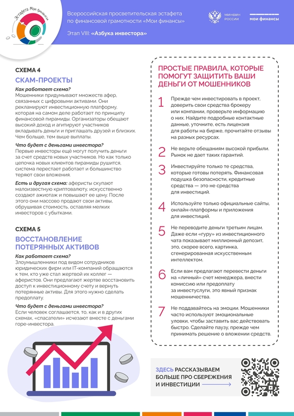 Этап посвящен инвестиционной грамотности. Он направлен на развитие навыков ответственного инвестирования и повышение уровня грамотного управления личными сбережениями, раскроет темы безопасности денег в цифровой среде, личных финансов с господдержкой и правила финансового поведения на маркетплейсах.